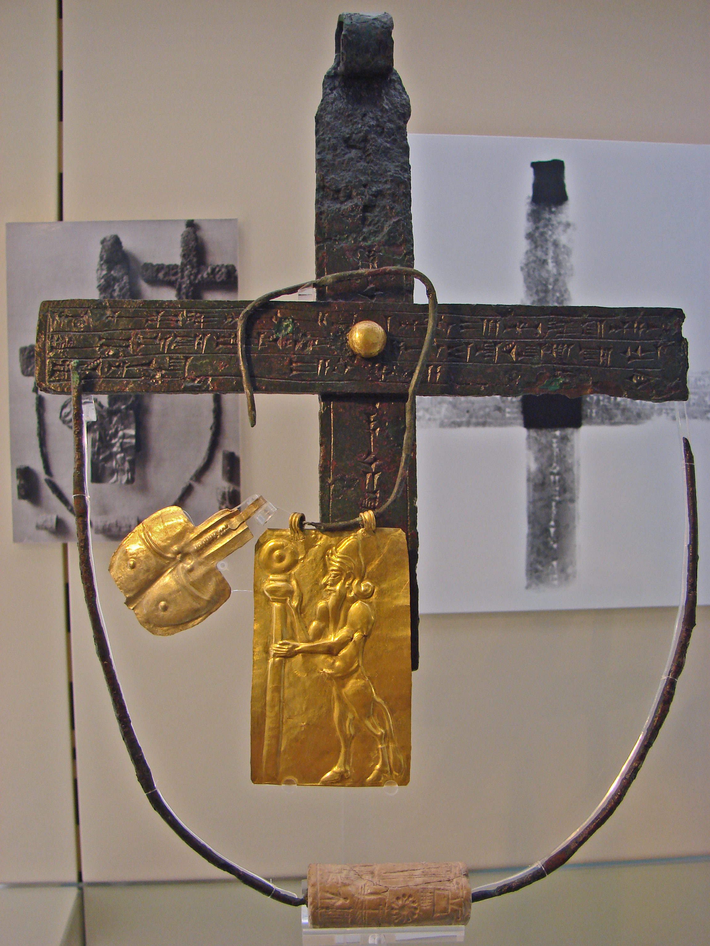 Description: The importance of this hoard found in the area of the Ashur-temple in Assur is not the text inscribed on the larger bronze cross, but the uniqueness of this find on the one hand and the relation between imagery and text. The hoard consisted among others of two crosses, two cylinder seals, a golden platelet, which depicts the human chest in relief as well as a second rectangular golden platelet with a depiction of the bull-man holding a standard in front of him. This mythological being is known as Kusarikku and this term is referred to in the text inscribed on the larger bronze cross. The text is dedicated to this being and was commissioned by the brewer of the Eshara-temple. Crosses are not uncommon in the imagery of Kassite cylinder seals. (Klaus Wagensonner, University of Oxford)